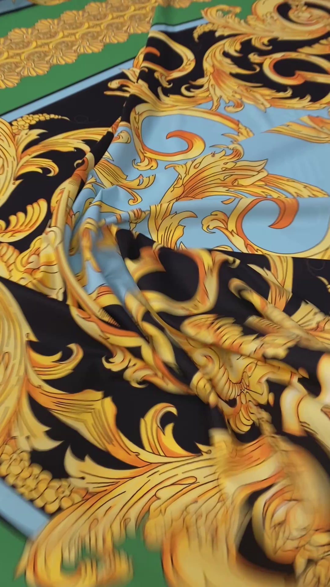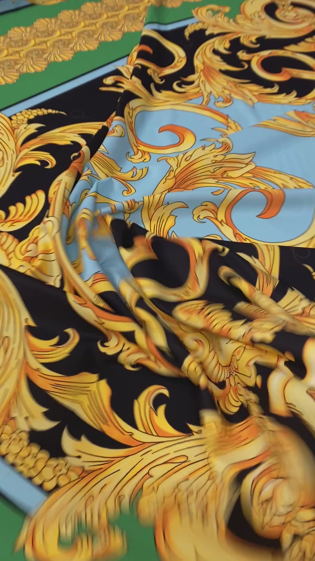 قماش كريب فاخر على الطراز الباروكي، متوفر بالمتر، يتميز بزخارف ذهبية مزخرفة على خلفية سوداء وزرقاء وخضراء. مثالي للفساتين المميزة والبلوزات الأنيقة ومشاريع الخياطة الفاخرة. جودة ممتازة مع توصيل سريع داخل المملكة المتحدة.
