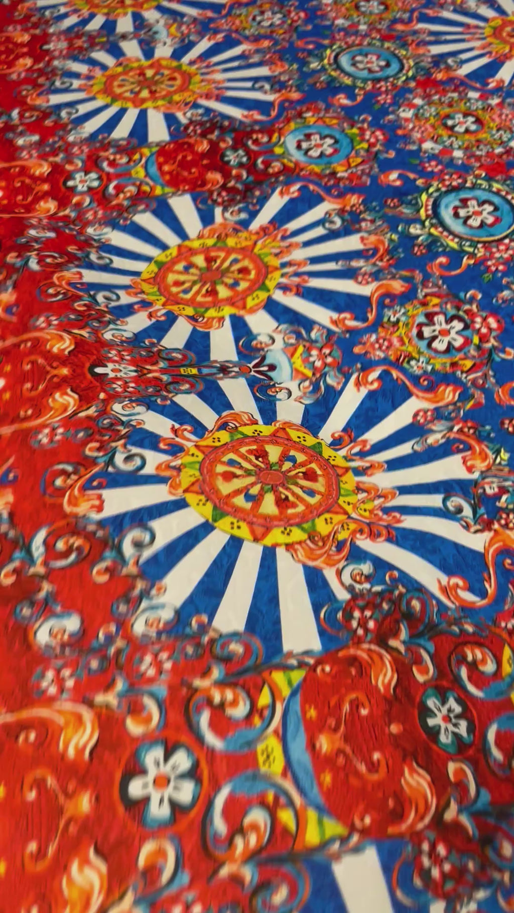 قماش كريب بطبعة كرنفال البحر الأبيض المتوسط بالمتر. يُباع بالمتر، مثالي لتصميم الفساتين والبلوزات والتنانير ومشاريع الأزياء الأنيقة.