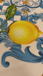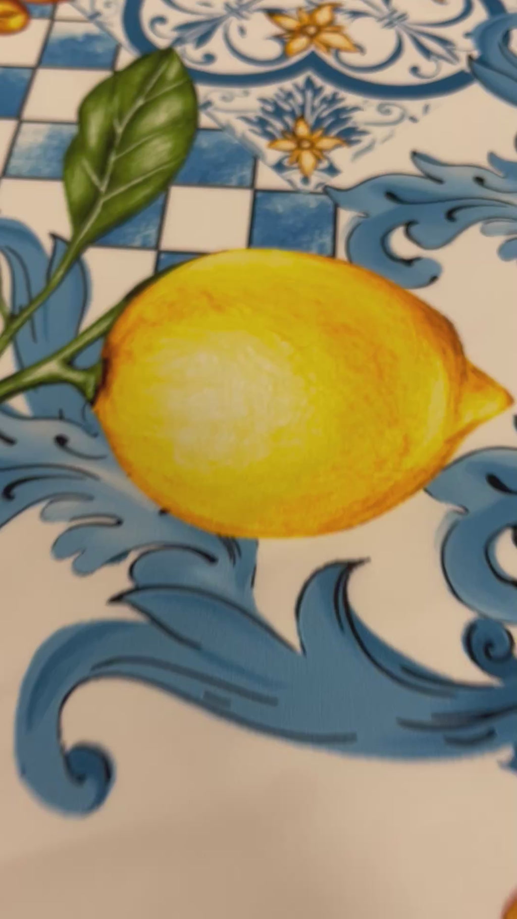 قماش كريب بطبعة الليمون والبلاط المتوسطي بالمتر. يُباع بالمتر، مثالي لتصميم الفساتين والبلوزات والتنانير ومشاريع الأزياء الأنيقة.