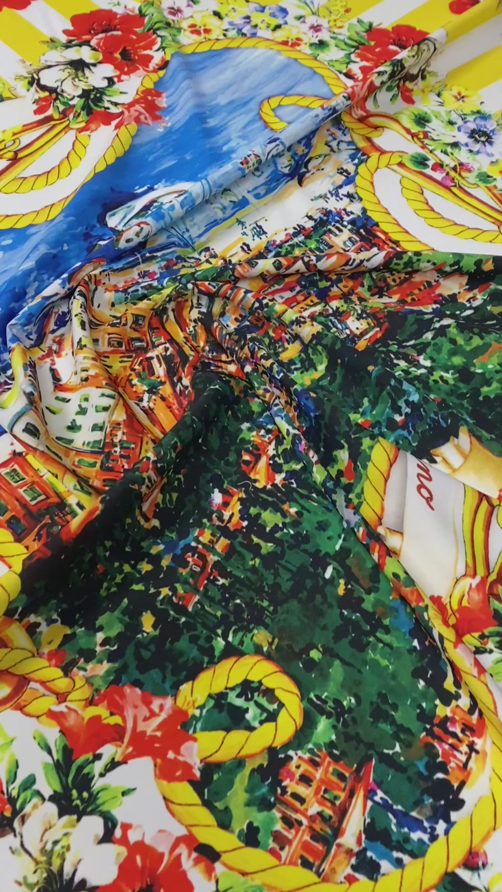 قماش كريب بطبعة البحر الأبيض المتوسط متوفر بالمتر. يُباع بالمتر، مثالي لتصميم الفساتين والبلوزات والتنانير ومشاريع الأزياء الأنيقة.