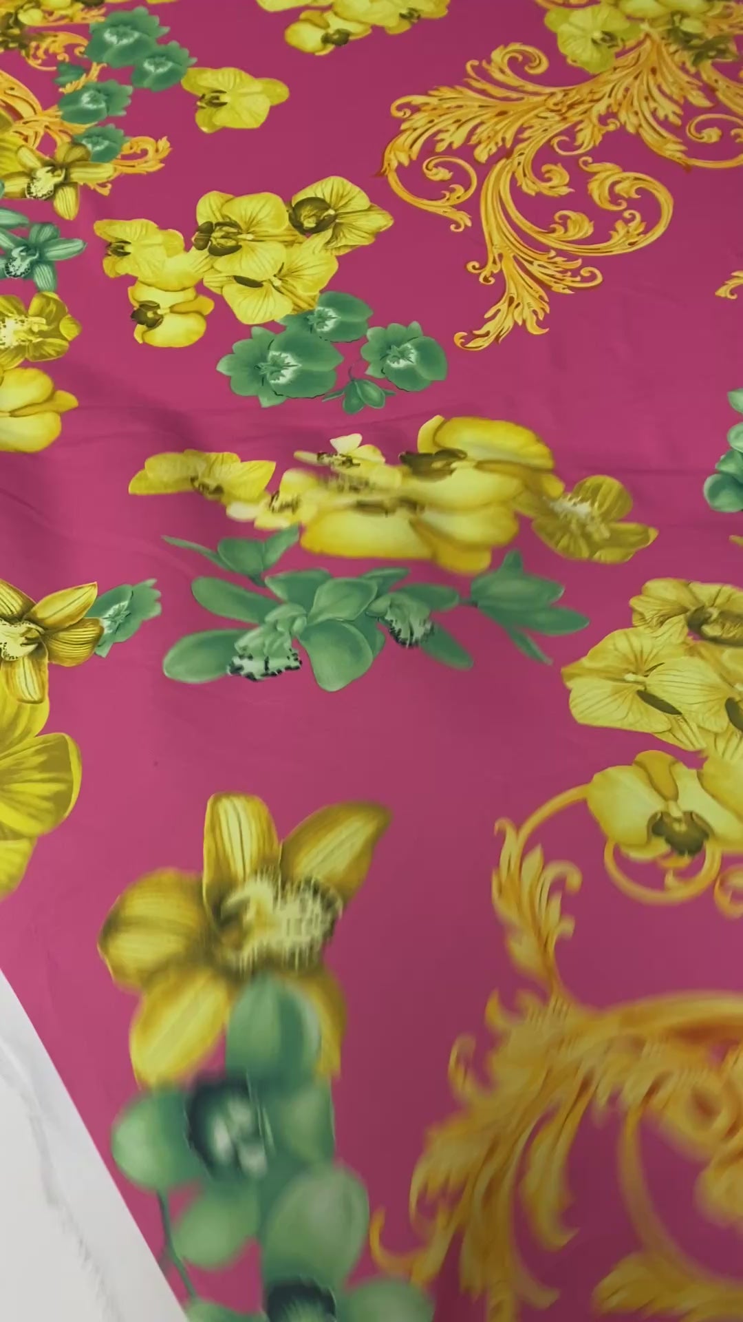 قماش كريب بنقشة زهور الأوركيد متوفر بالمتر. يُباع بالمتر، مثالي لتصميم الفساتين والبلوزات والتنانير ومشاريع الأزياء الأنيقة.