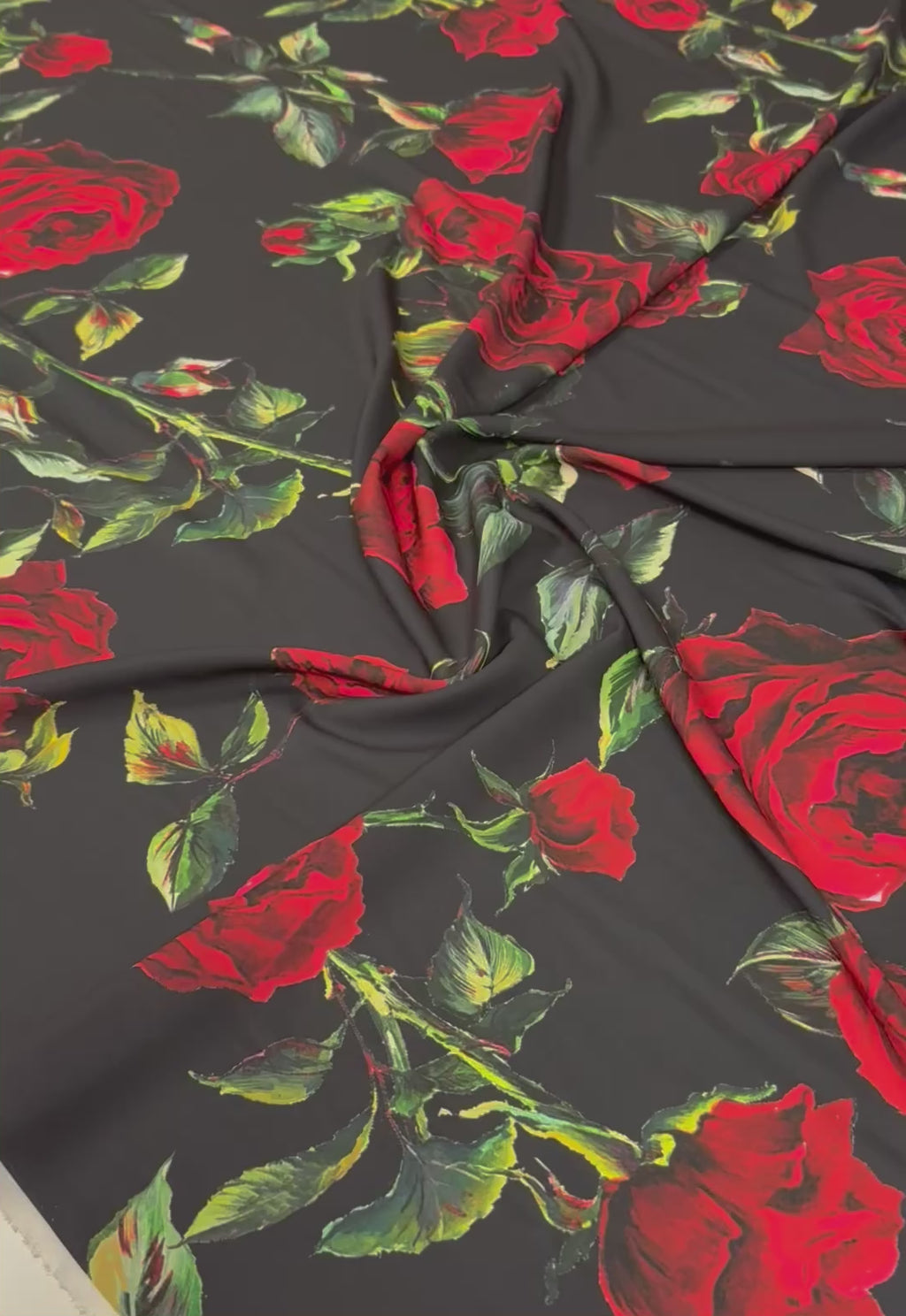 قماش بنقشة ورود باللونين الأسود والأحمر للخياطة والحرف اليدوية – قماش مطبوع حسب الطلب على الساتان أو الكريب أو الإسباندكس أو الشيفون