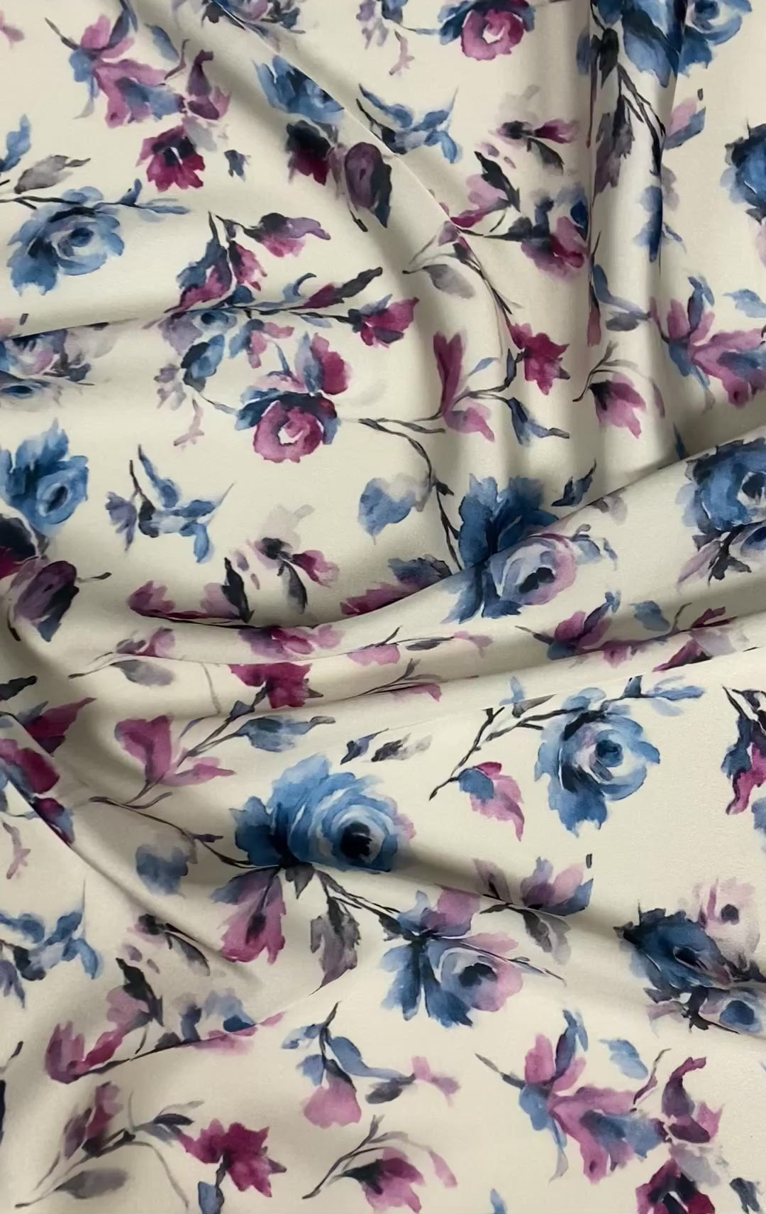 قماش كريمي ناعم بورود مائية زرقاء وأرجوانية. مثالي للفساتين الأنيقة والبلوزات وديكورات المنزل الرومانسية.