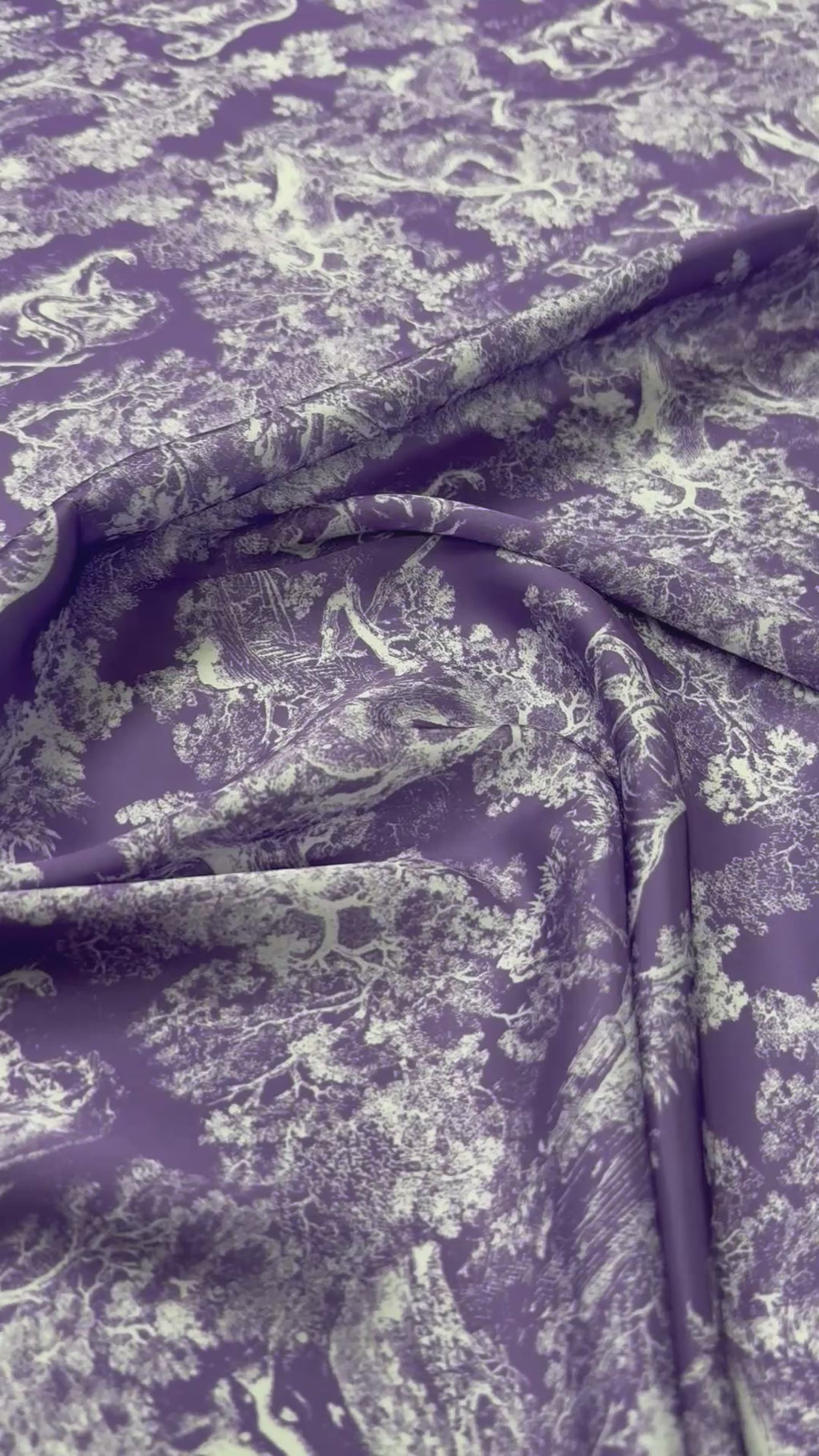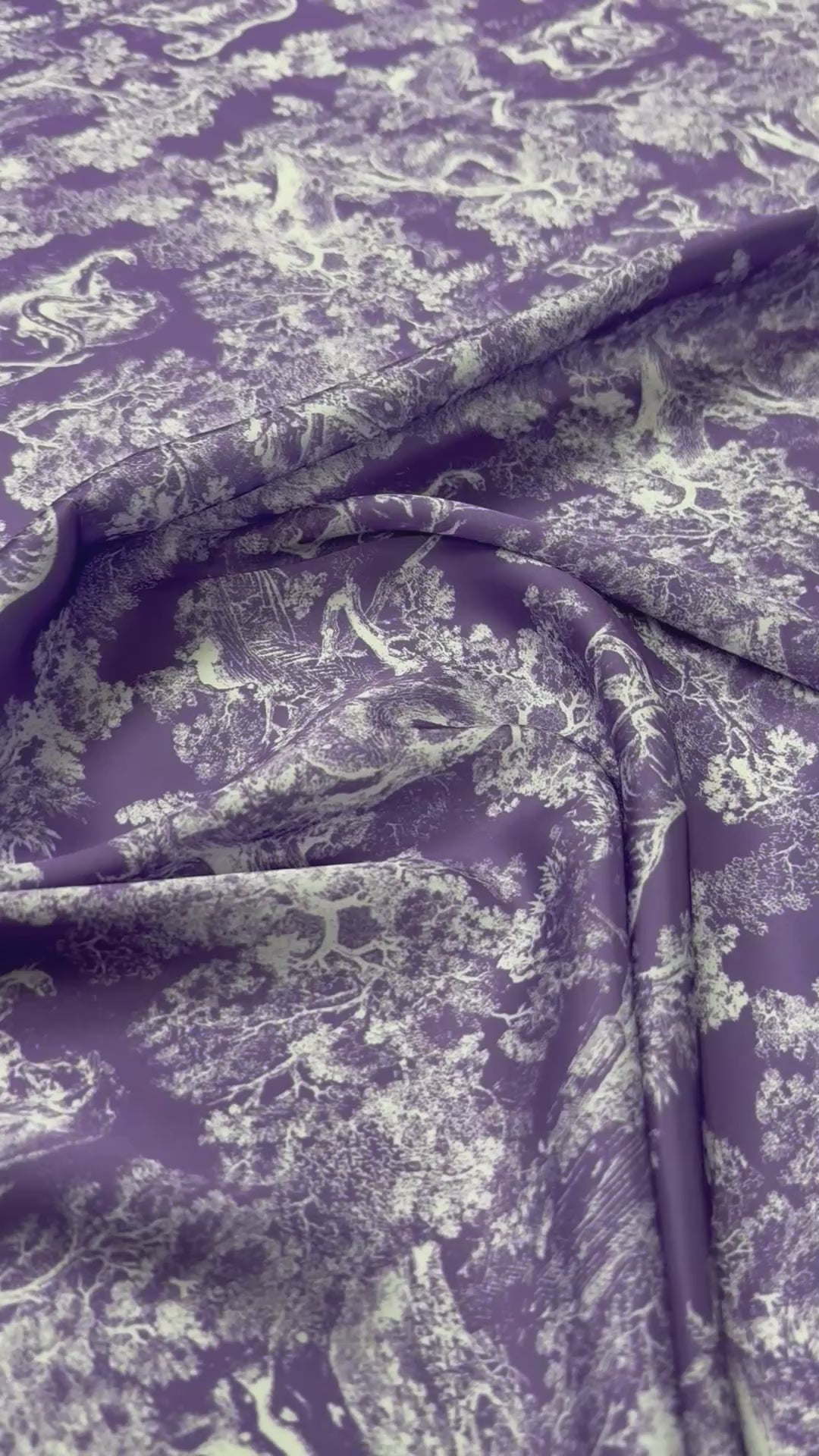 قماش ساتان ناعم بطبعة توال أنيقة على قاعدة أرجوانية غنية. لمعان ناعم وانسيابية، مثالي للفساتين والبلوزات والتنانير ومشاريع الخياطة المميزة. يُباع بالمتر.