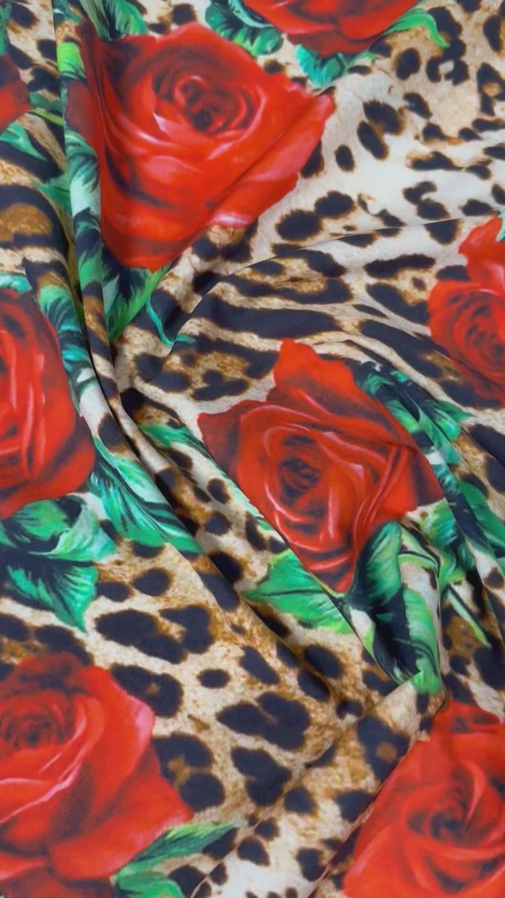 مزيجٌ رائع من نقشة جلد النمر والورود الحمراء على قماش بوبلين قطني عضوي. عرض ١٥٠ سم، مثالي للفساتين والقمصان المميزة.
