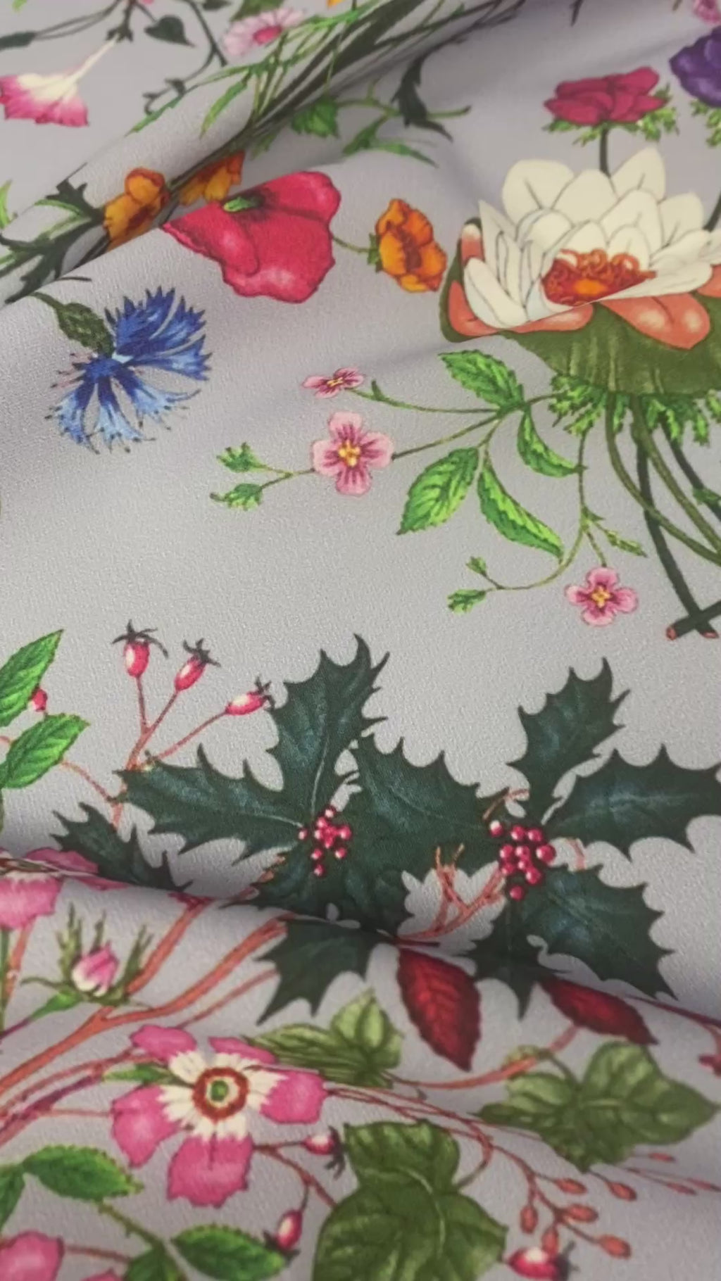 زهور ملونة على قماش رمادي فاتح - قماش مطبوع حسب الطلب، اختر المادة بالمتر