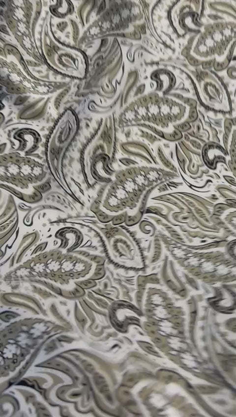 قماش بيزلي أنيق بدرجات البيج والكريمي. ملمس ناعم ونقشة خالدة، مثالي للفساتين والقمصان وديكورات المنزل الأنيقة. يُباع بالمتر.