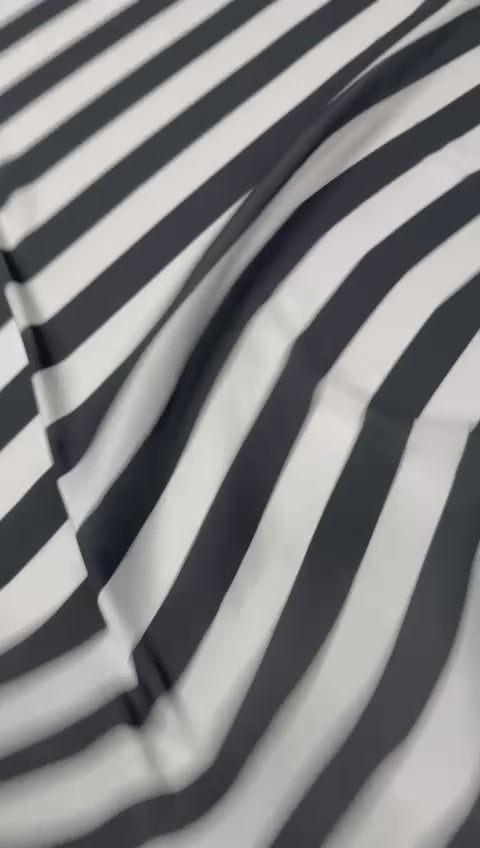 قماش كلاسيكي مخطط بالأبيض والأسود، بلمسة نهائية ناعمة وثنيات أنيقة. مثالي للفساتين والتنانير والقمصان ومشاريع الخياطة الإبداعية.
