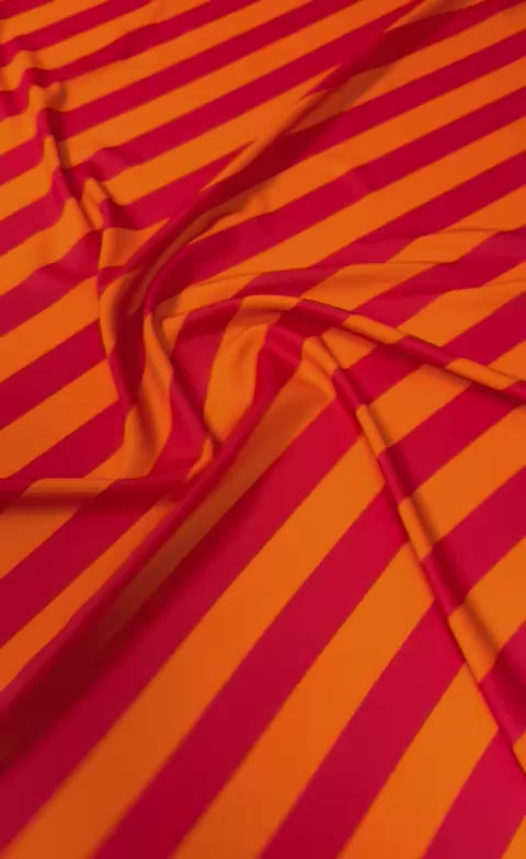 قماش مخطط باللونين البرتقالي والأحمر الجريء، يتميز بثنيات ناعمة وملمس ناعم. مثالي للفساتين والبلوزات والأشغال اليدوية والمشاريع الداخلية المميزة.