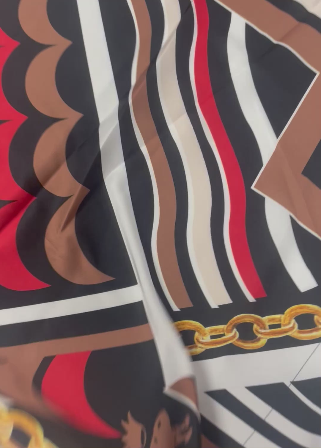 قماش بطبعة هندسية جريئة بألوان البني والأحمر والأسود، مزين بسلاسل ذهبية. مثالي للسترات والأوشحة والأزياء المميزة.