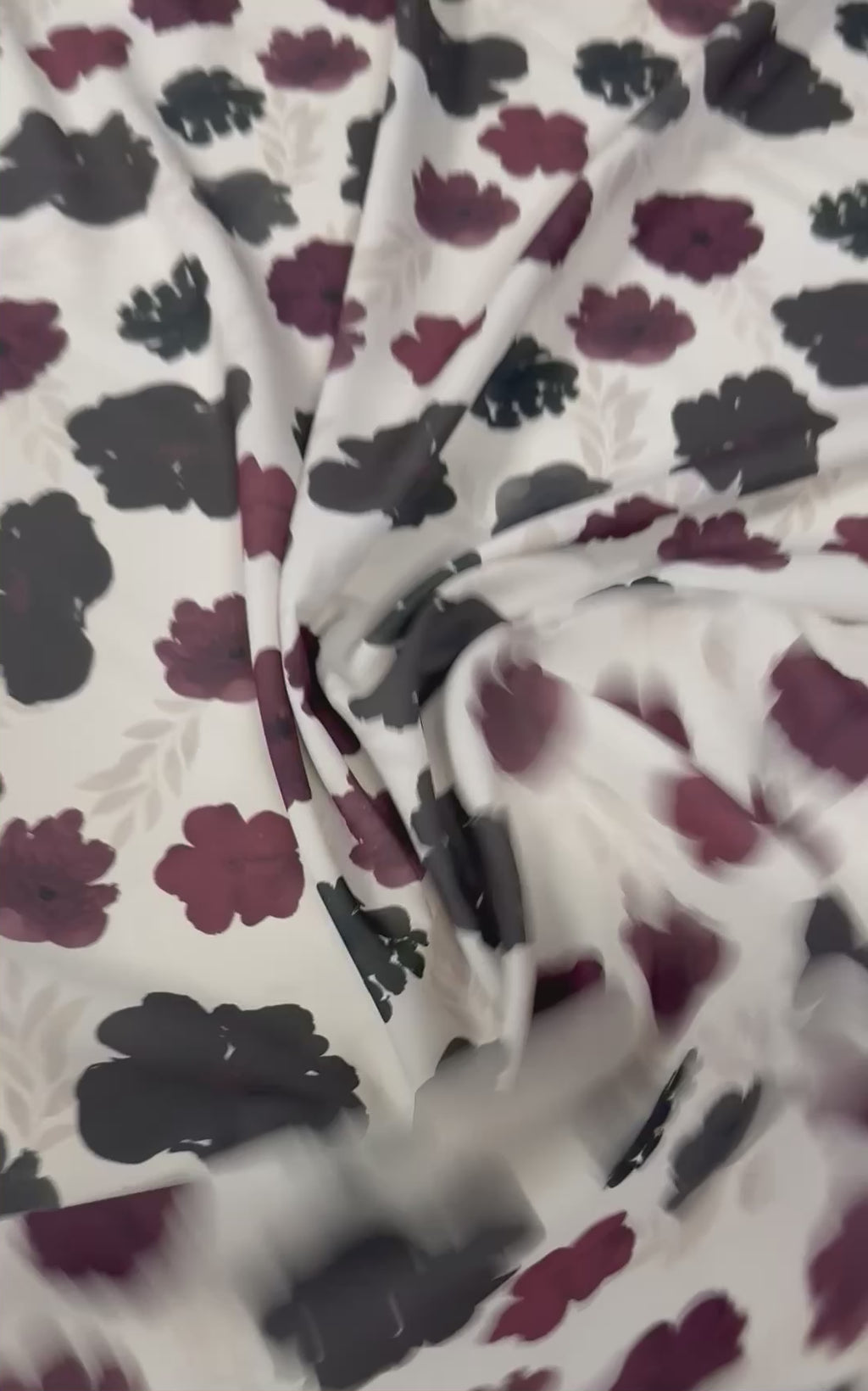 قماش أنيق بطبعة زهور باللونين العنابي والأسود، يتميز بثنيات ناعمة. مثالي للفساتين والبلوزات والتنانير ومشاريع الخياطة الأنيقة طوال العام.