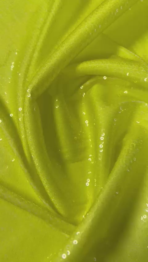 قماش ترتر أصفر نيون نابض بالحياة، يتميز بثنيات ناعمة ولمسة نهائية لامعة. مثالي لفساتين الحفلات، وملابس الرقص، وأزياء المهرجانات، ومشاريع الأزياء الجريئة.