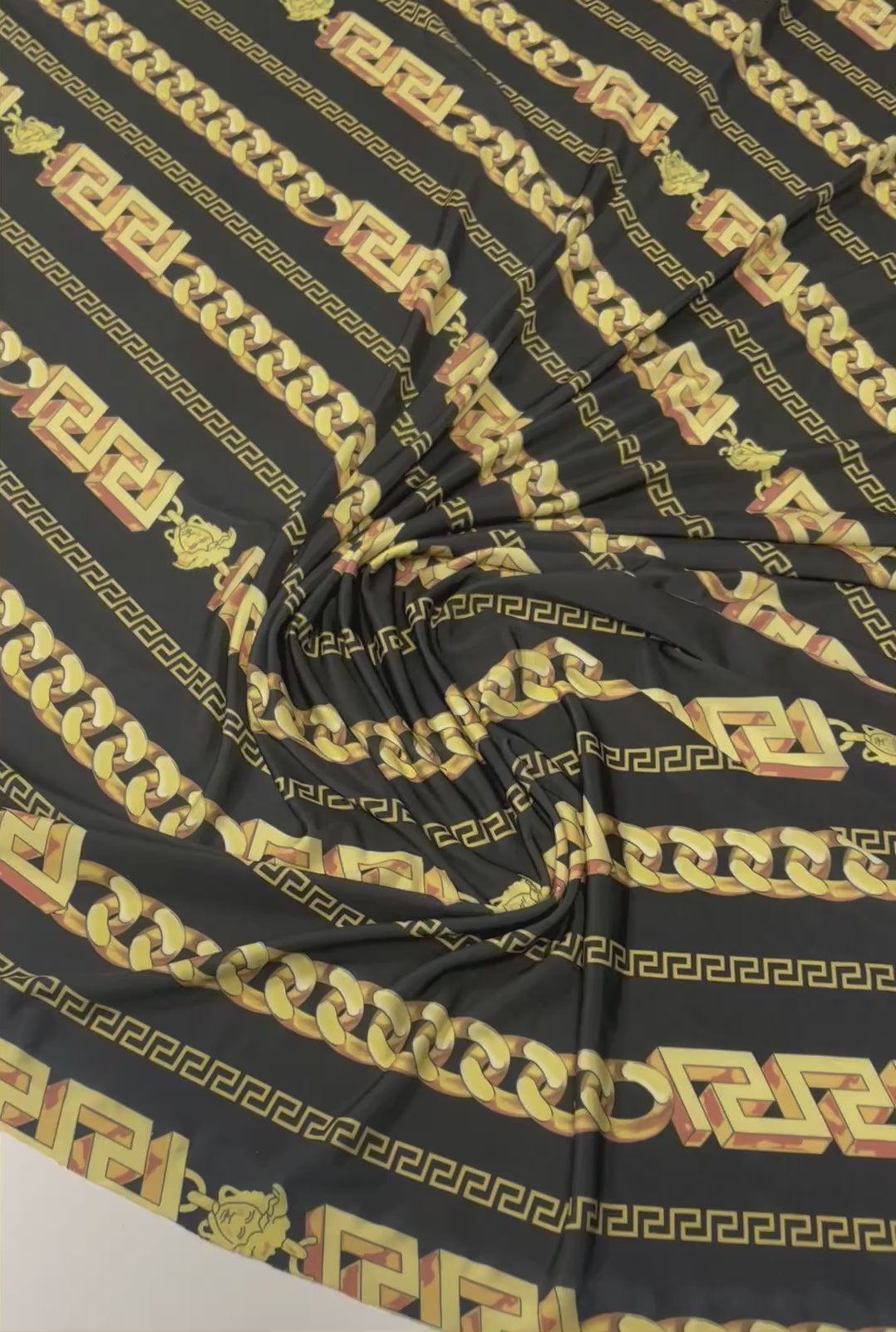Luxurious black fabric with gold chain and geometric stripe design. Ideal for dresses, shirts, scarves and statement fashion projects.