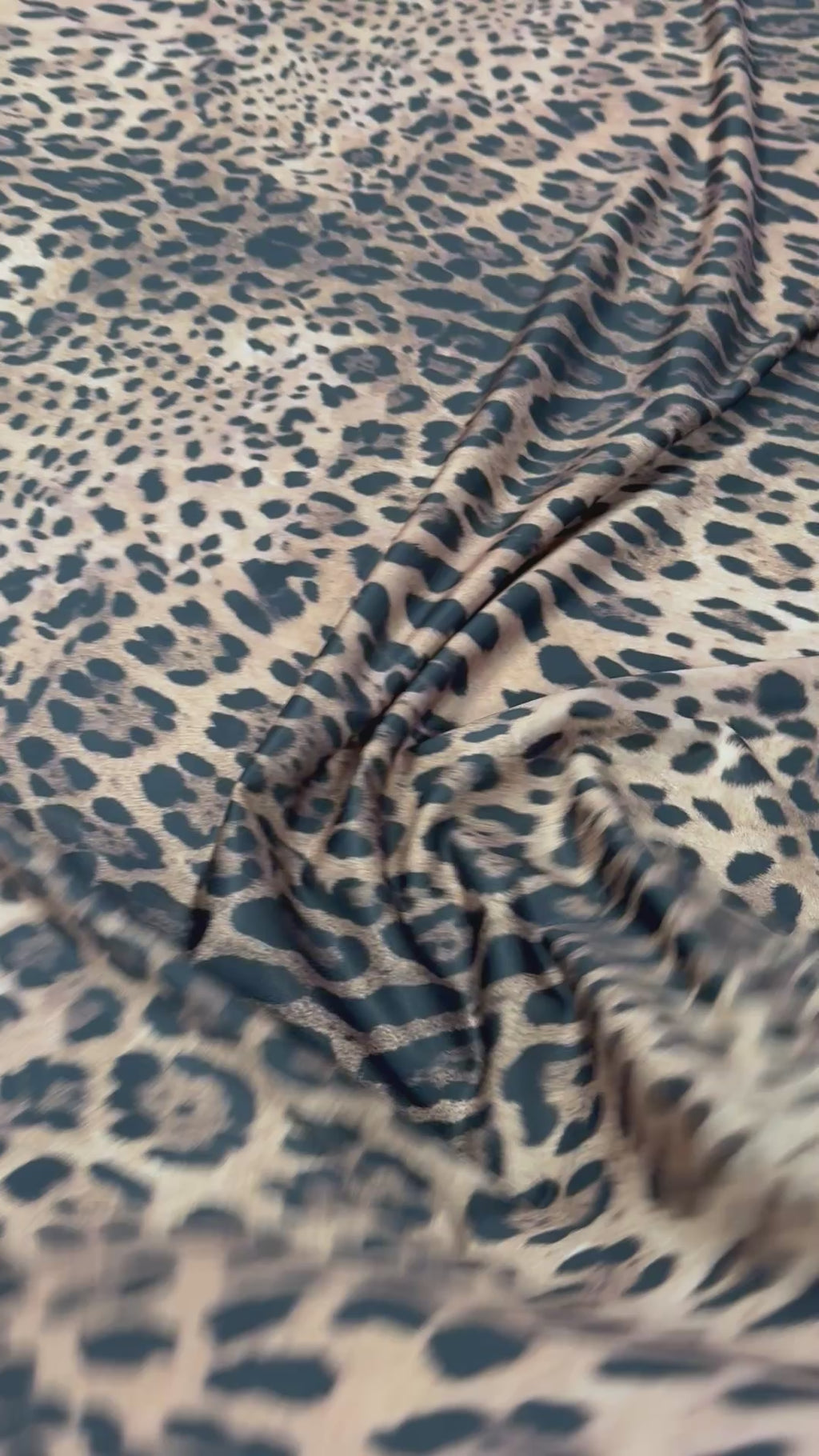 Stretchy spandex fabric with a classic leopard print in warm beige and black tones. Soft, flexible and ideal for dresses, tops, leggings and bold fashion projects. Sold by the metre.