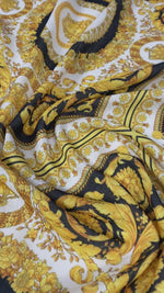 Luxurious Baroque Medusa Pattern Fabric in Black and Gold – Custom Printed Fabric on Satin, Crepe, Spandex or Chiffon