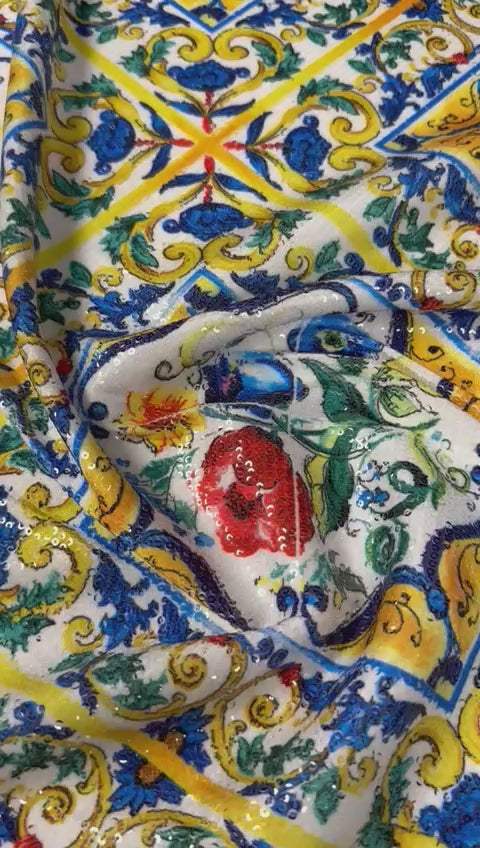 Vibrant Mediterranean tile print fabric with subtle sequins and a soft drape. Perfect for summer dresses, resort wear, skirts and statement sewing projects.
