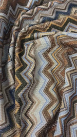 Shimmering lurex fabric with bold chevron stripes in brown and blue tones. Perfect for dresses, skirts and statement styles, sold by the metre.