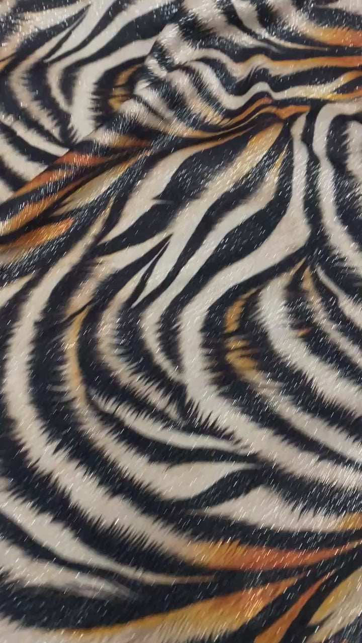 Shimmering lurex fabric with bold zebra stripes in gold and black tones. Perfect for dresses, jackets and statement looks, sold by the metre.
