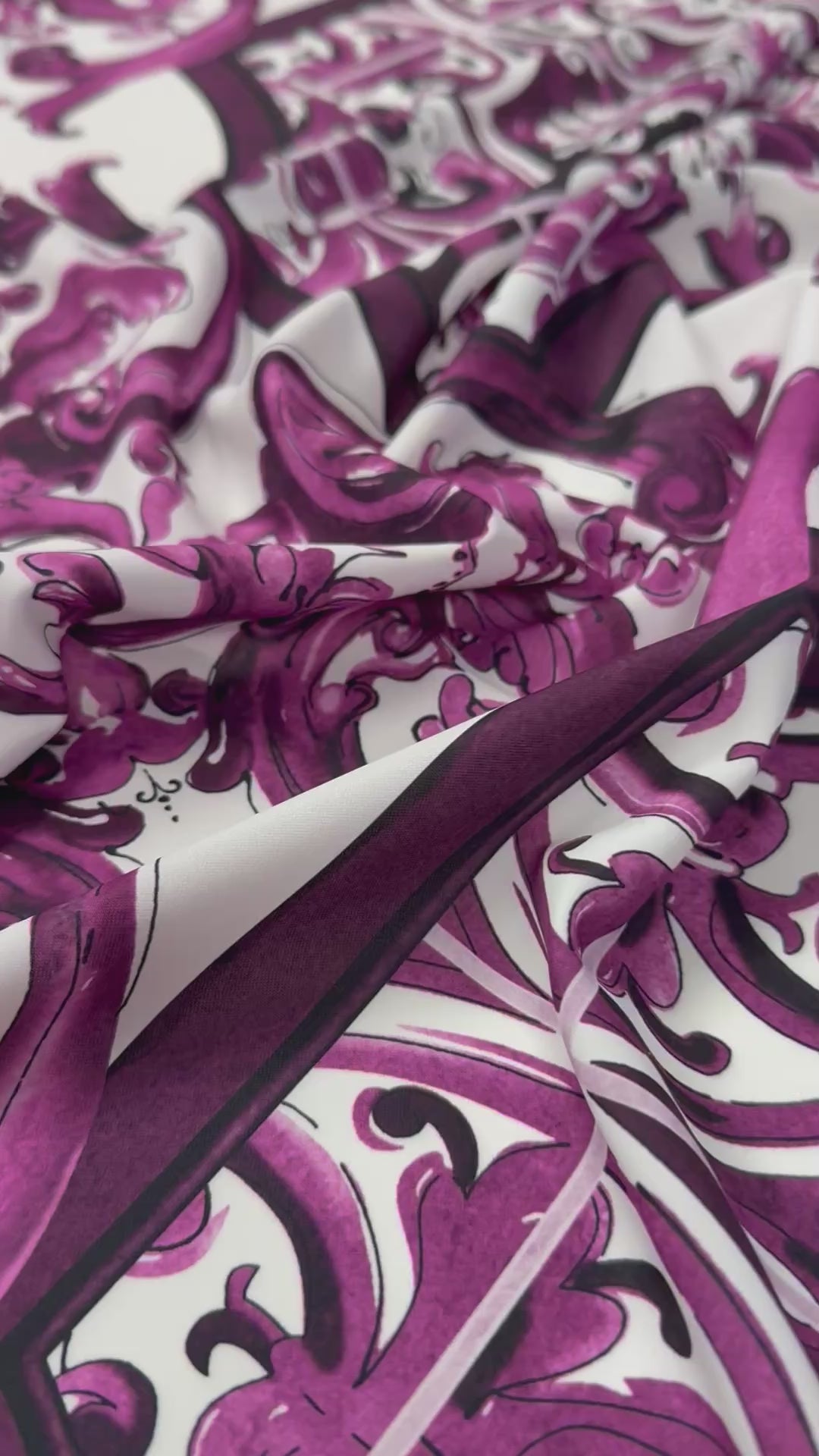 Elegant purple baroque print crepe fabric with a smooth texture and fluid drape. Perfect for dresses, blouses, tunics, skirts and stylish sewing projects. Sold by the Metre.