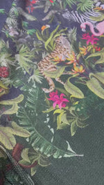 Vibrant tropical jungle sequin fabric with flamingo, zebra and leopard details. Ideal for statement dresses, beachwear, resort outfits, dancewear and creative sewing.