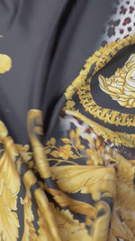 Smooth satin fabric featuring rich gold baroque motifs on a deep black base. Glossy, lightweight and ideal for dresses, blouses, scarves and luxury sewing projects. Sold by the metre.