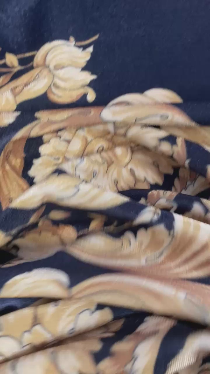 Elegant navy baroque floral fabric with a refined, luxurious look. Perfect for dresses, blouses, eveningwear, kaftans and high-end sewing projects.