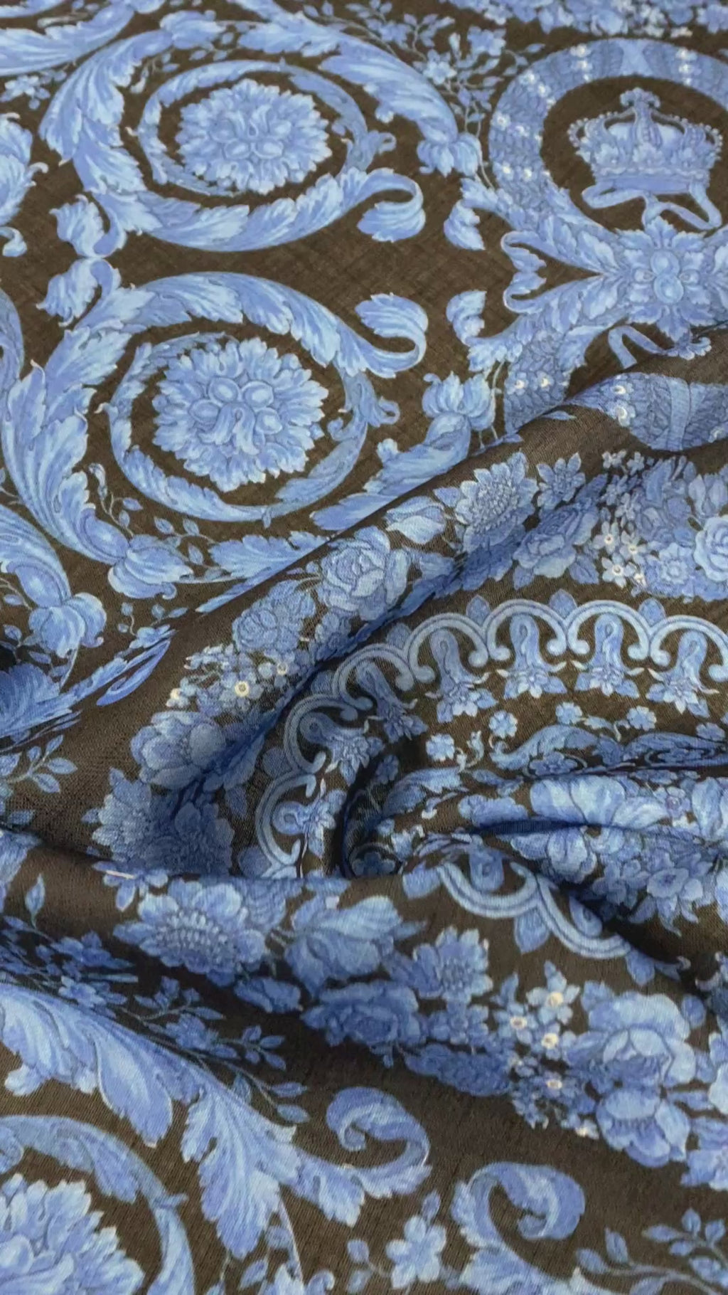 Elegant blue baroque floral linen fabric, ideal for dresses, cushions or curtains. Add timeless sophistication to your next sewing project.