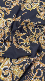 Discover our elegant Gold Baroque Pattern Fabric in black and gold. This luxurious fabric features a stunning baroque design, perfect for adding a touch of sophistication to your home decor or fashion projects. Ideal for upholstery, drapery, or crafting, this fabric combines style and quality, making it a versatile choice for any creative endeavor.
