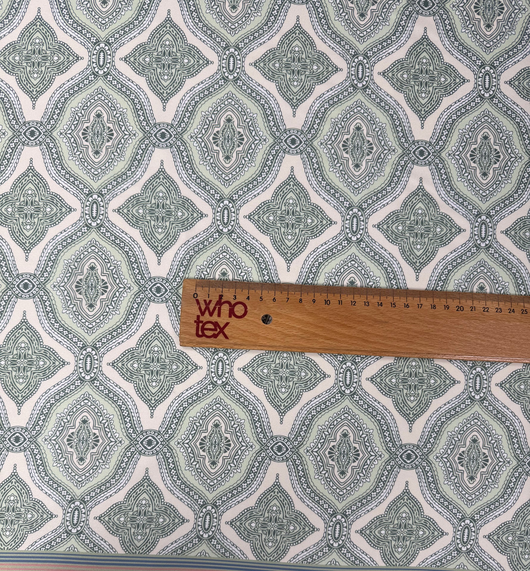 Introducing our Tribal Geometric Fabric, featuring a soft green and pink ethnic pattern with stylish border stripes. This fabric is perfect for various sewing projects and adds a unique touch to your creations. Its vibrant colors and intricate design make it a great choice for anyone looking to enhance their fabric collection.
