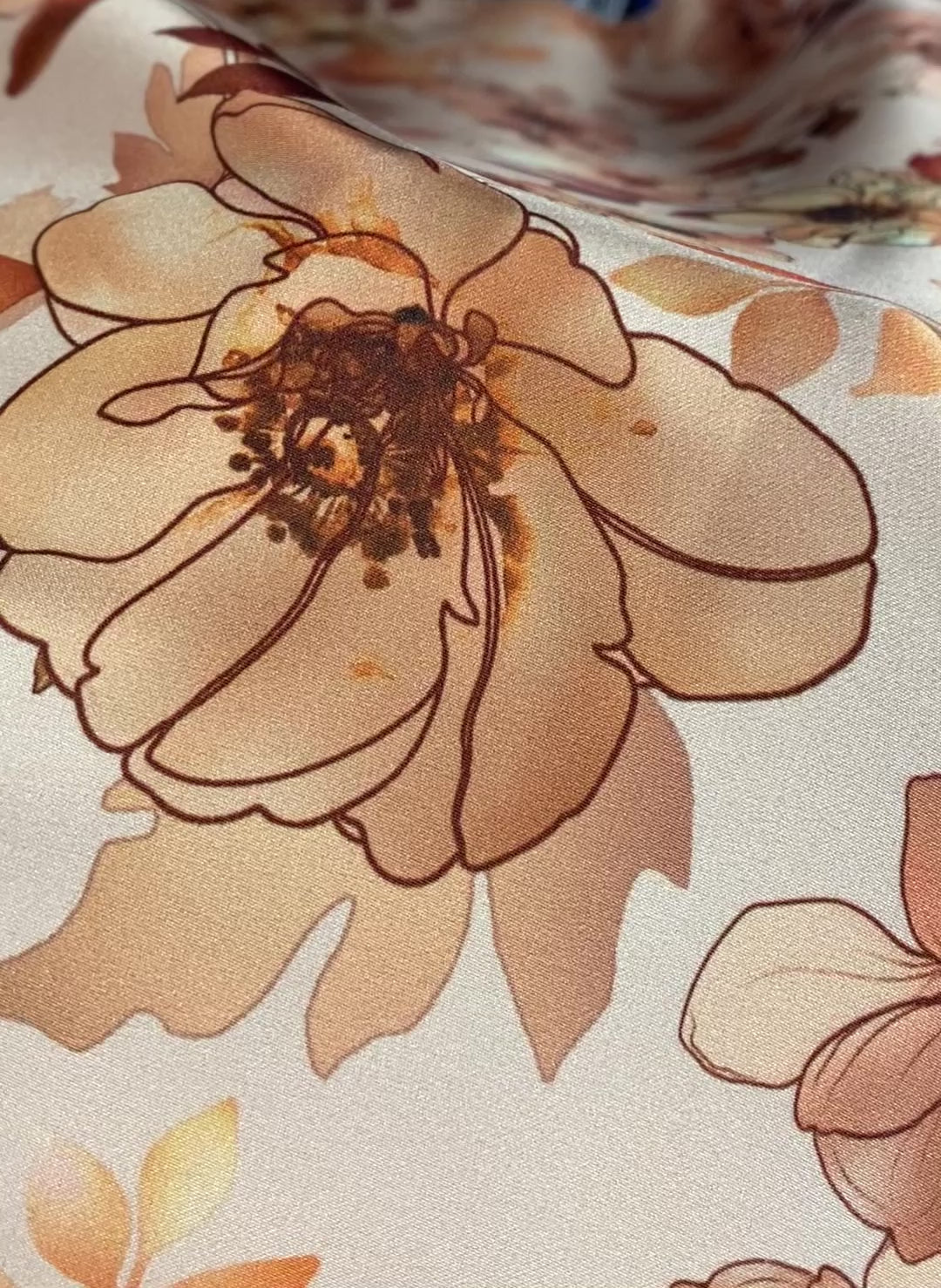 Soft beige floral fabric with brown and cream tones. Ideal for dresses, blouses, and home textiles.
