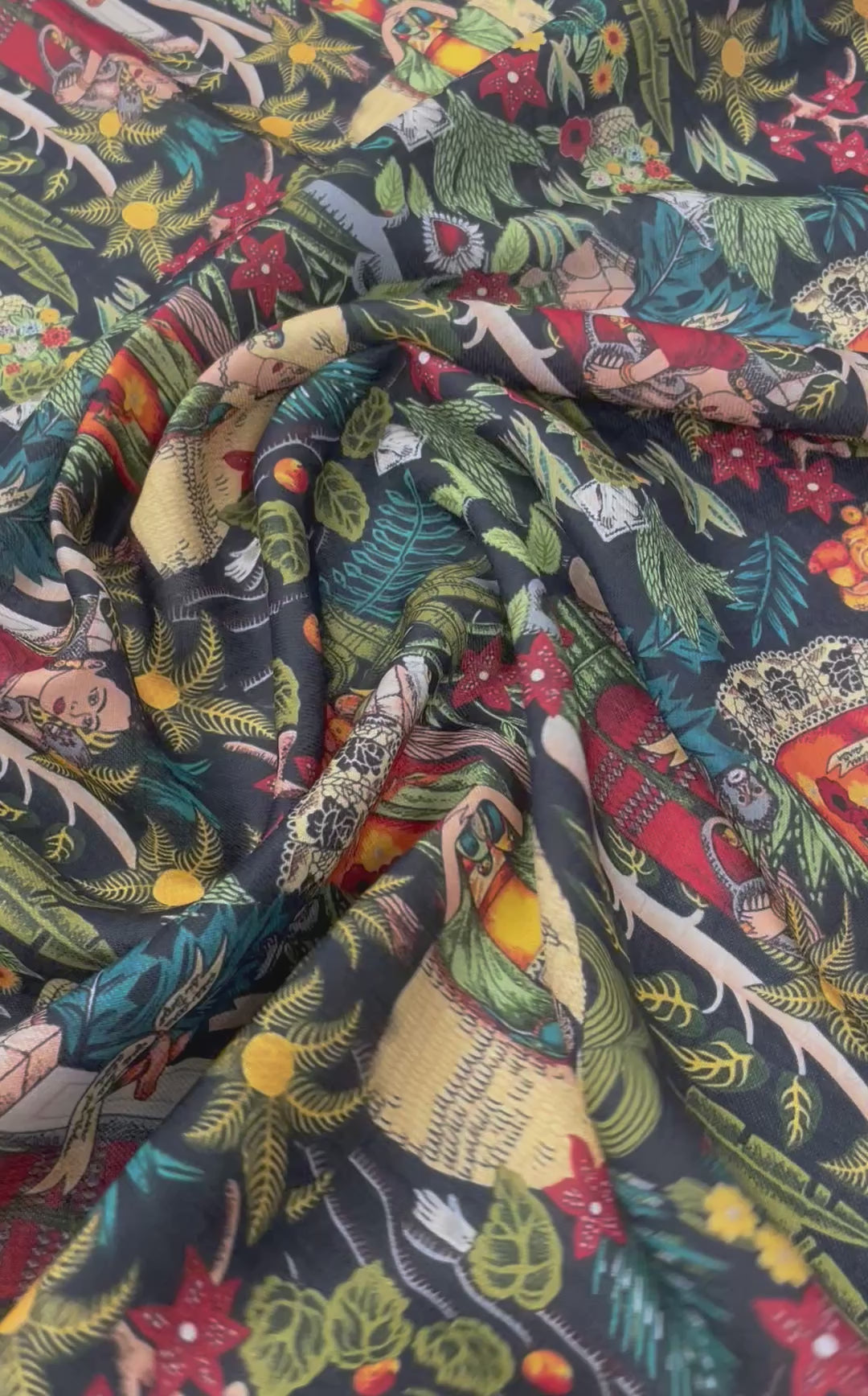 Striking Frida Kahlo tropical fabric on black. Bold colours, perfect for dresses, skirts, décor and craft projects. Sold by the metre in continuous length.