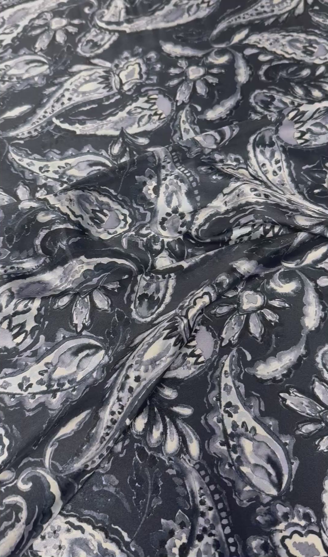 Stylish grey paisley fabric with a soft, elegant finish. Ideal for dressmaking, blouses, scarves, skirts and timeless sewing projects.