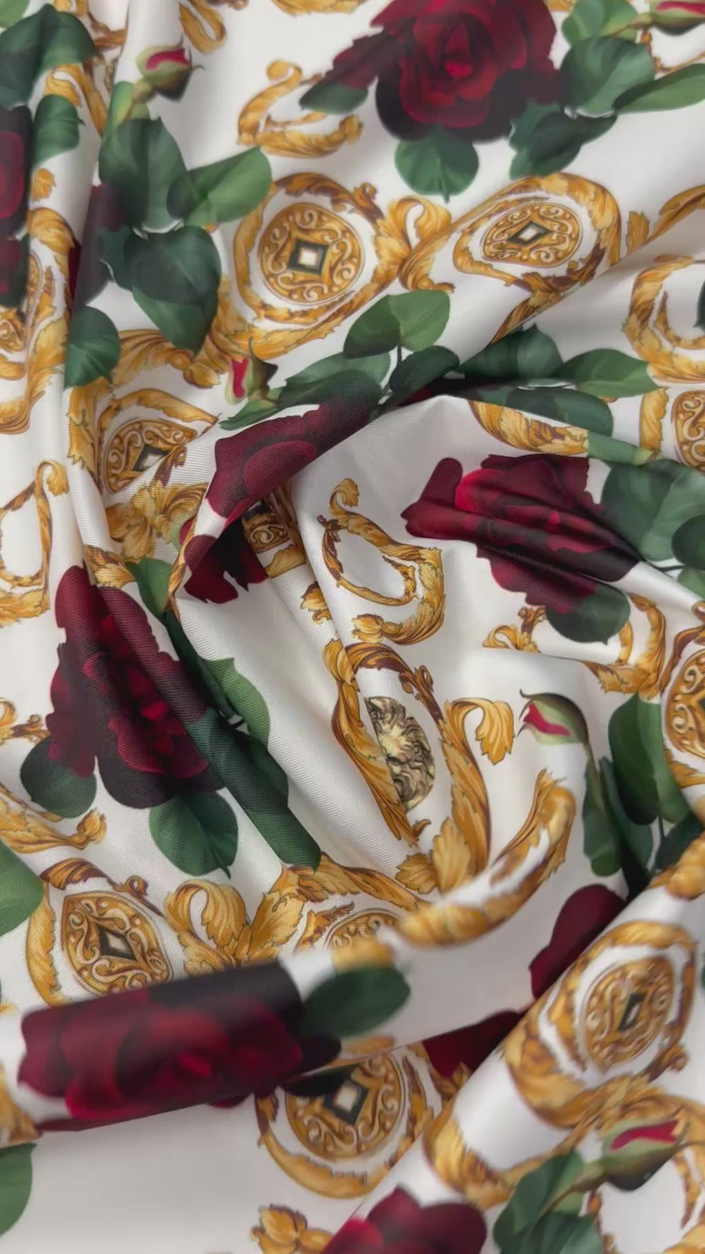 Elegant baroque rose print spandex fabric with smooth stretch and vibrant detail. Ideal for dresses, skirts, tops and stylish craft projects. Sold by the metre.