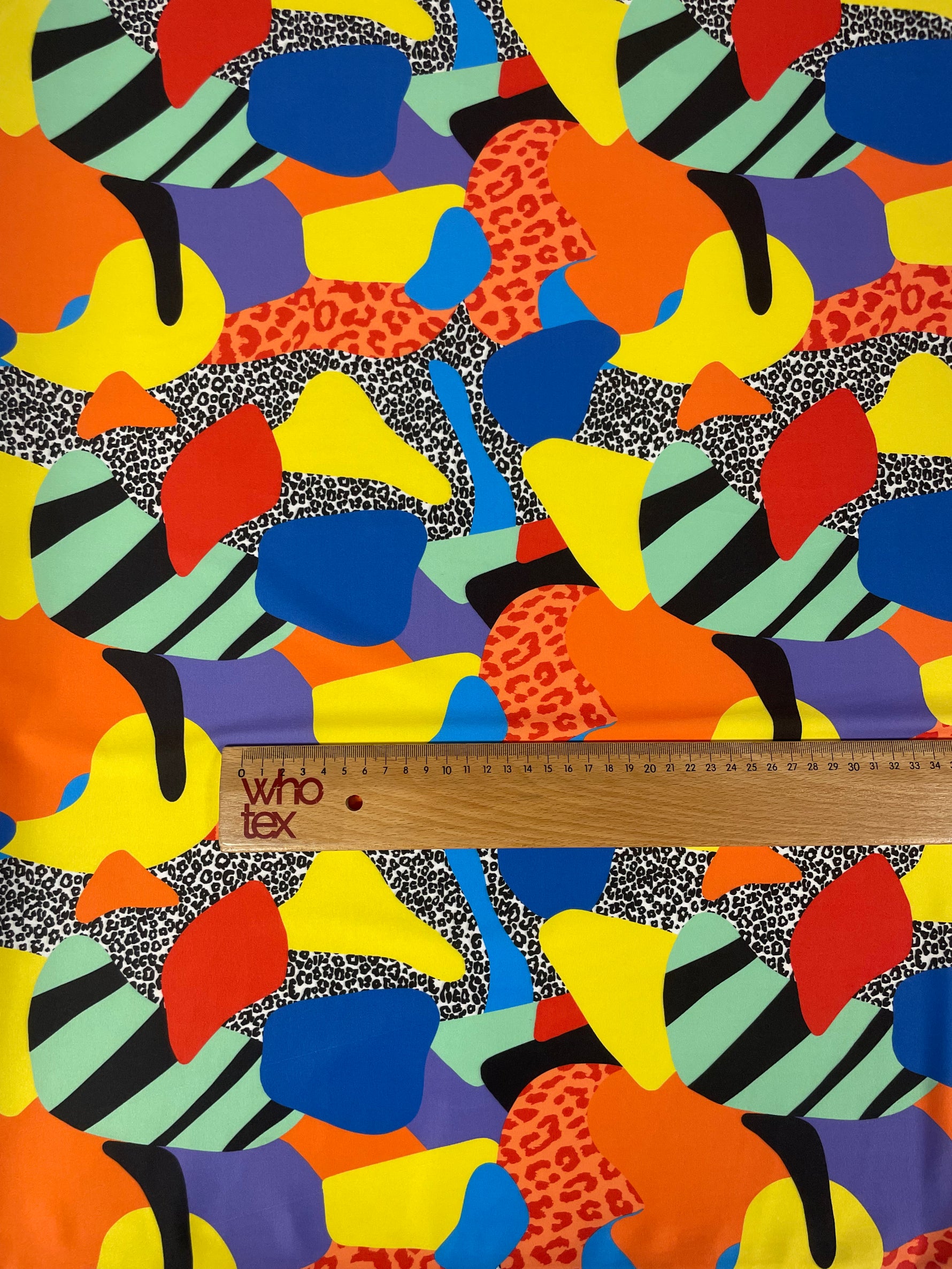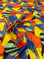 Vibrant abstract fabric with bold colours, leopard spots and stripe details. Perfect for dresses, tops, statement fashion and creative sewing.