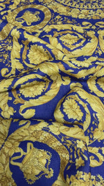 Luxurious royal blue linen fabric with gold baroque details. Perfect for elegant dresses, upholstery and sophisticated home décor.
