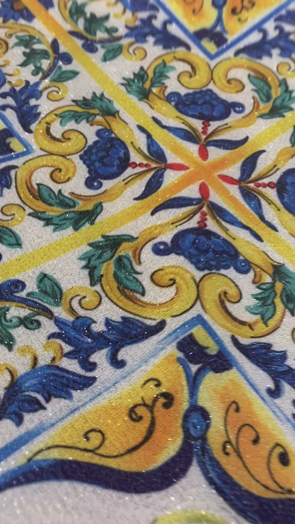 Elegant lurex fabric with Mediterranean tile print in blue, gold, and red. Perfect for statement dresses, decor, or creative design projects.