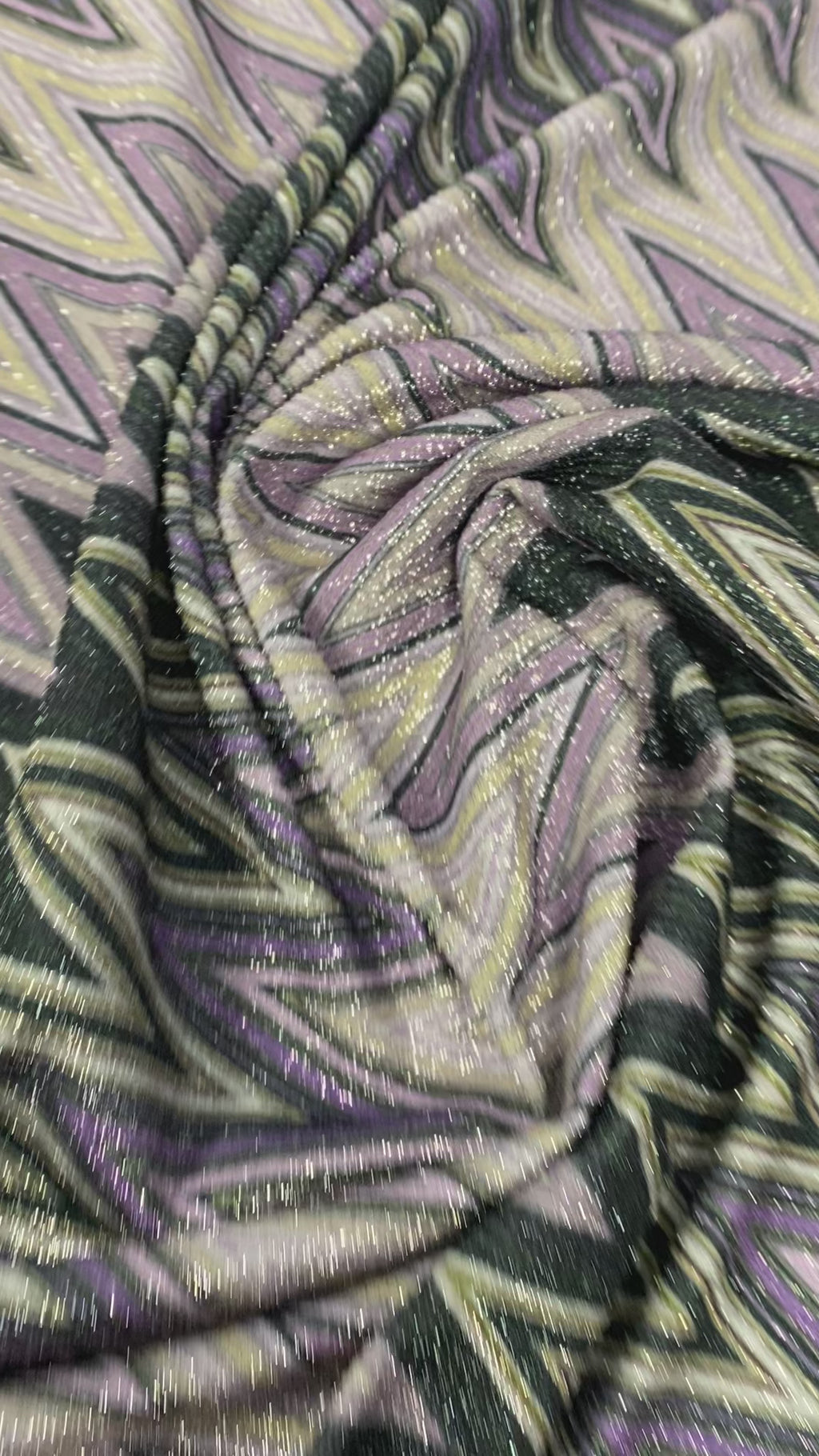 Choose this purple chevron fabric to elevate your designs with its unique metallic zigzag pattern and soft texture. The combination of lurex knit fabric with robust 4-way stretch makes it a top pick for designers seeking both beauty and function in their textiles. Transform your sewing projects with this versatile purple zigzag fabric that blends creativity with comfort seamlessly.