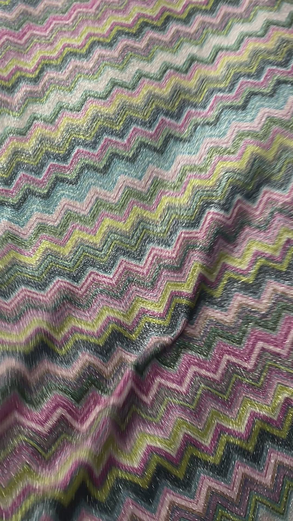 Vibrant zigzag lurex fabric in pink, green, and blue tones. Perfect for dresses, skirts, or creative fashion projects, sold by the metre.