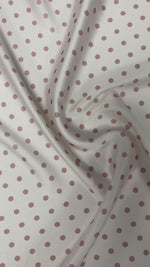 Delicate beige fabric with soft pink polka dots. Perfect for dresses, blouses, or vintage-inspired craft and home projects.