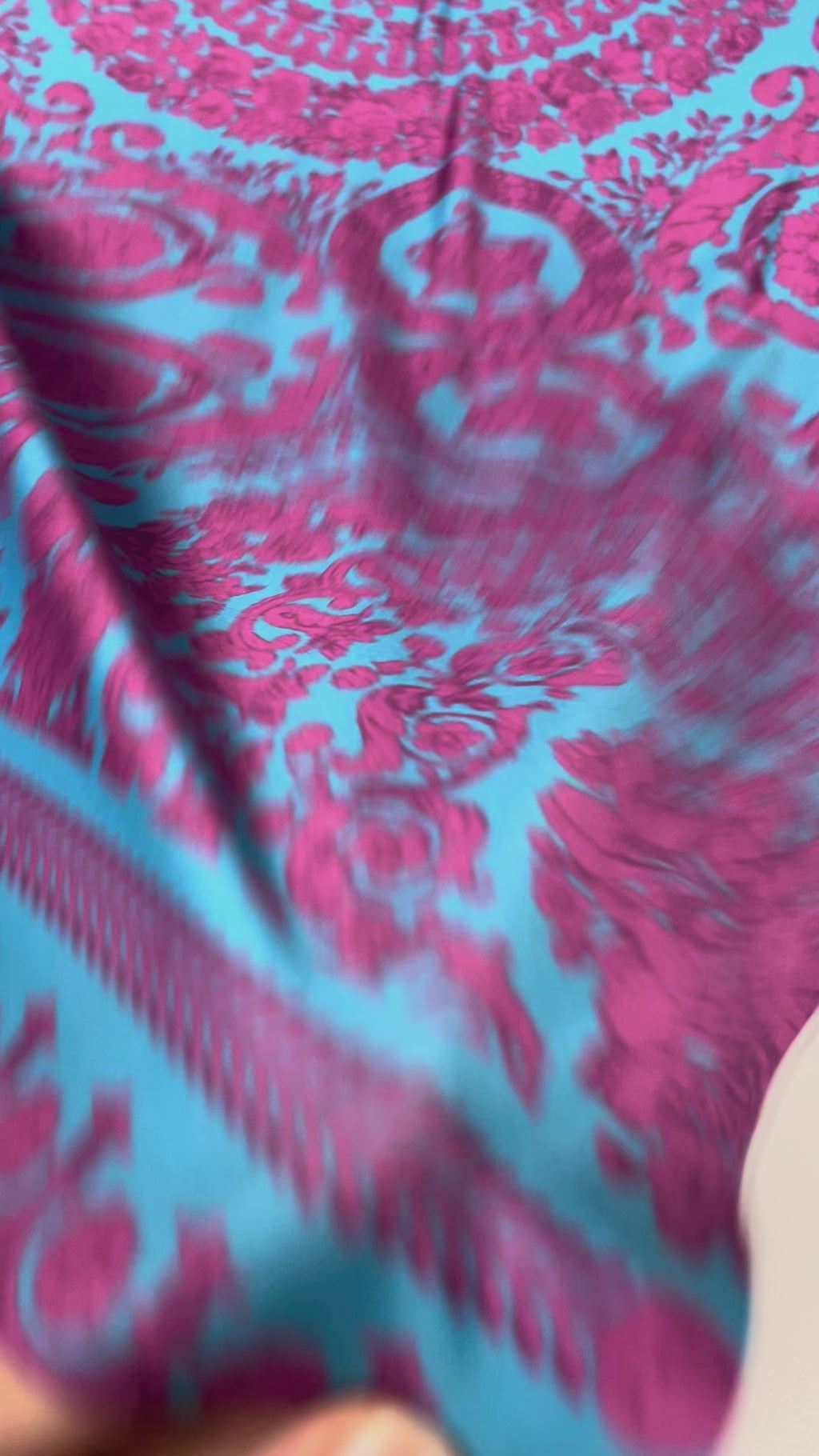 Baroque Floral Spandex Fabric Turquoise Pink by the Metre