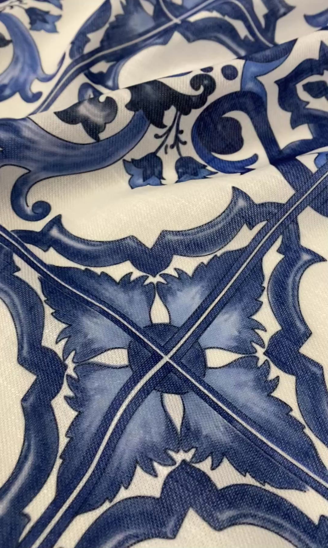 Premium linen fabric with elegant blue ornamental pattern on a clean white base. Breathable, natural and ideal for dresses, shirts, crafts and home décor. Sold by the metre.