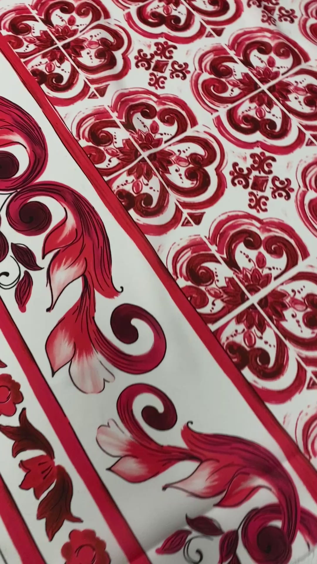 🔴 Ornamental red baroque tile crepe fabric. Lightweight, flowy, great for skirts, blouses, dresses & creative sewing projects.