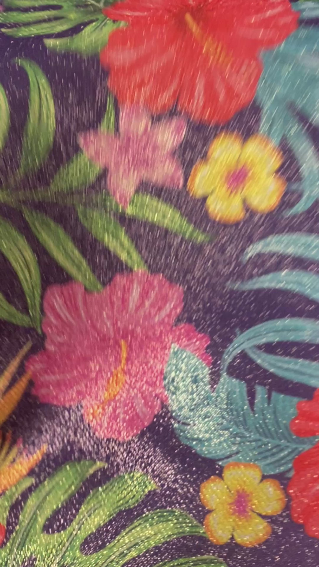 Vivid tropical lurex fabric featuring hibiscus flowers and lush leaves. Perfect for statement dresses, beachwear, or vibrant fashion projects.