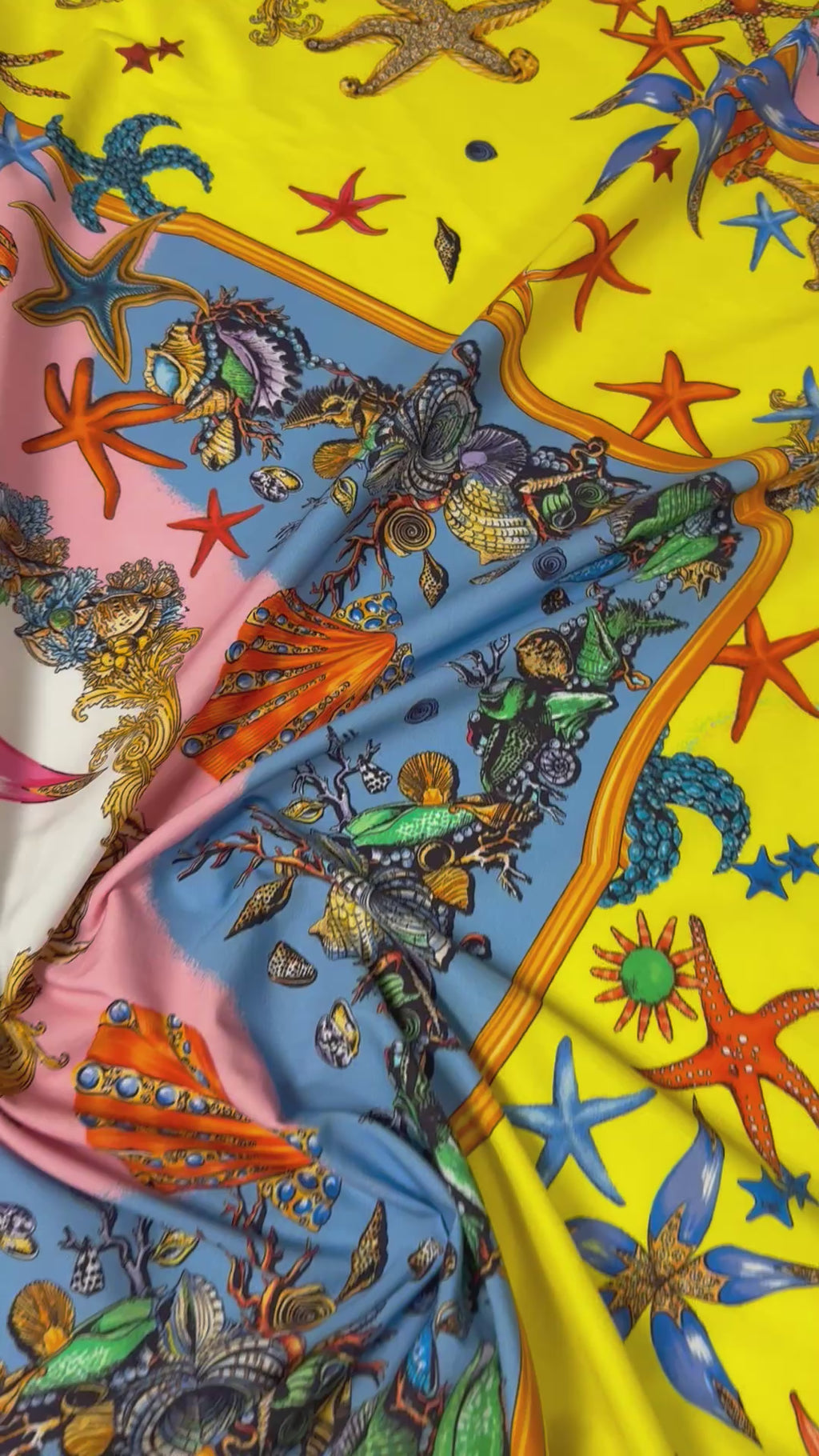 Vibrant multicolour starfish and seashells on organic cotton poplin. Breathable 150cm width – ideal for beachy dresses, shirts and accessories.