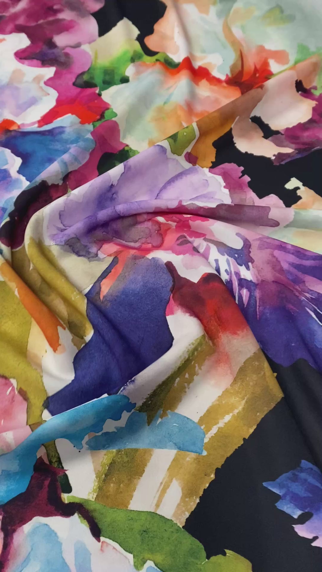 Watercolour Floral Crepe Fabric by the Metre – Black with Colourful Flowers