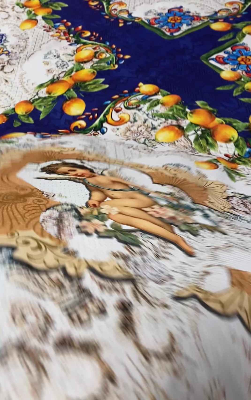 قماش كريب فاخر بطبعة ليمونية وملاك باروكي. طراز متوسطي، مثالي للفساتين والتنانير والملابس الصيفية. يُباع بالمتر.