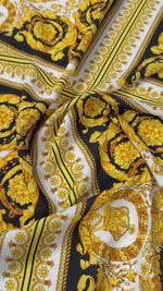 قماش كريب أنيق بطبعة باروكية مميزة بدرجات اللونين الذهبي والأسود. يتميز بثنيات ناعمة وملمس ناعم، مثالي للفساتين والبلوزات ومشاريع الخياطة الأنيقة.