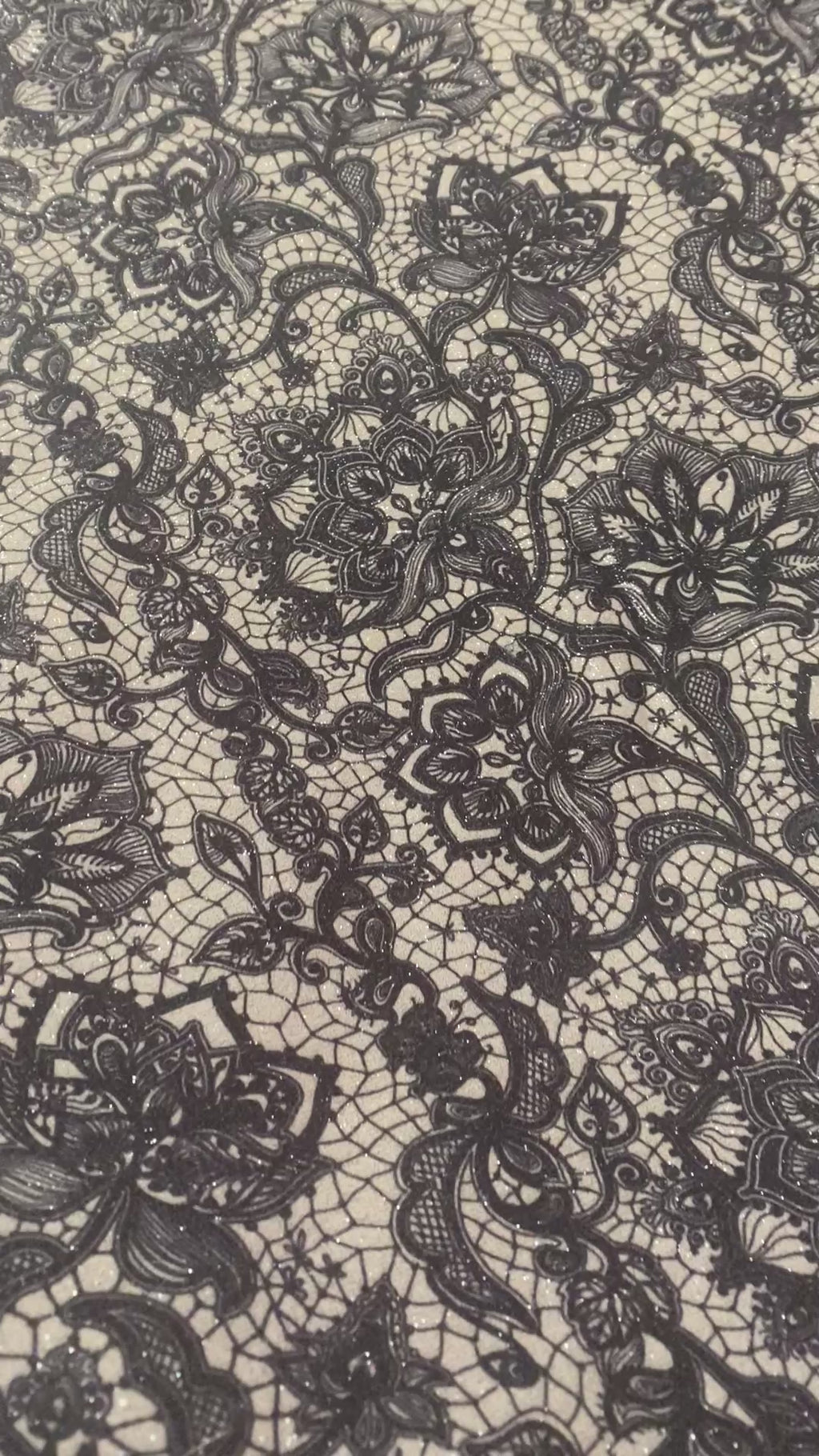 قماش دانتيل لوركس أسود أنيق بتصميم زهور لامعة. مثالي للفساتين وفساتين السهرة والتفاصيل الأنيقة، يُباع بالمتر.