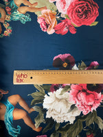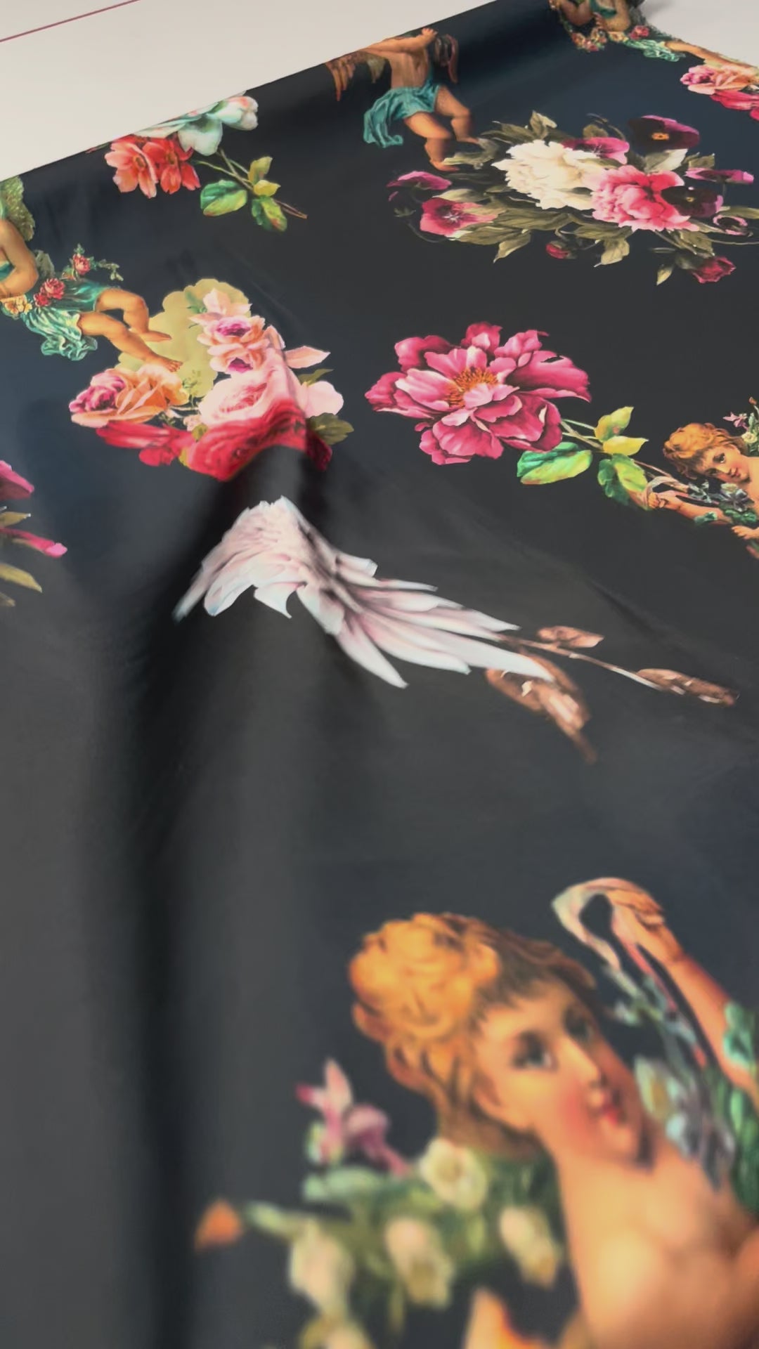 قماش ساتان أسود فاخر بنقشة ملائكية رومانسية وزهور. مثالي للفساتين المميزة والبلوزات الأنيقة والأزياء ومشاريع الخياطة الإبداعية.