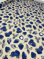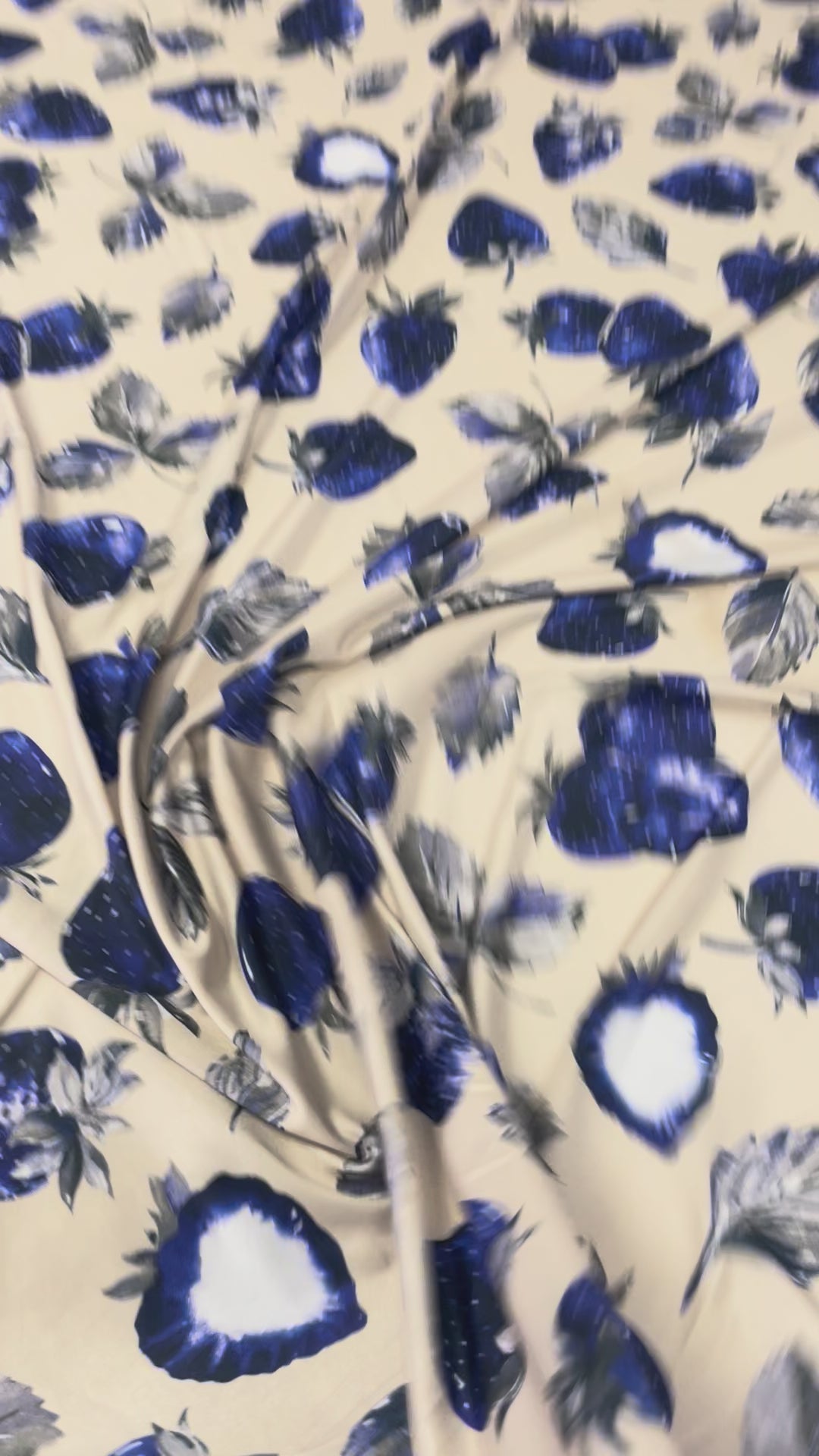 قماش بيج فريد بطبعة فراولة زرقاء جريئة. مثالي للفساتين والبلوزات وملابس الأطفال ومشاريع الخياطة الإبداعية. يُباع بالمتر.